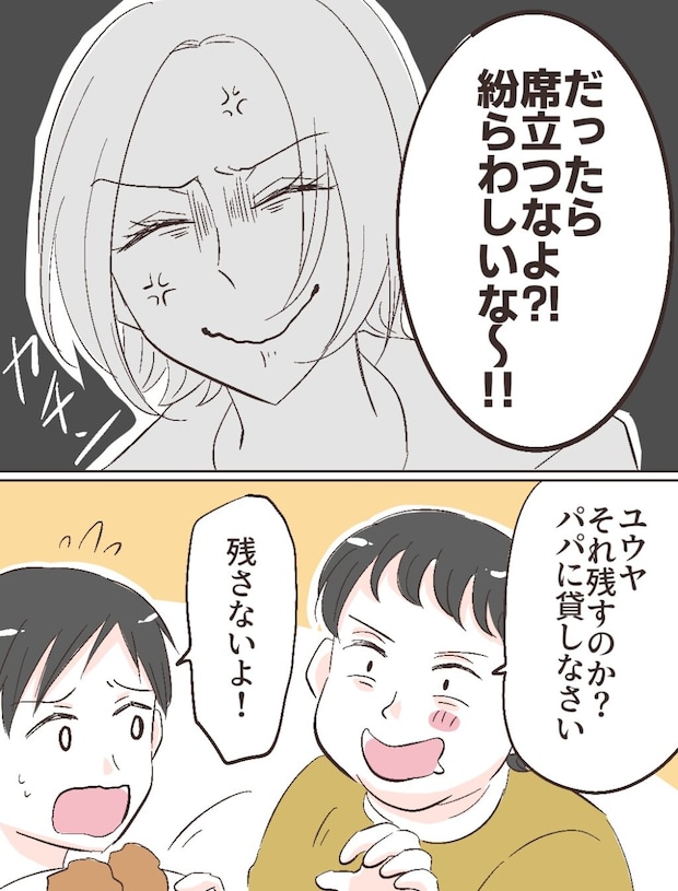 「だったら席立つなよ!?紛らわしいな~!!」とフトシに言われ、カチンと来た私。フトシはというと、「ユウヤそれ残すのか?パパに貸しなさい」と手を出すフトシに、「残さないよ!」とユウヤも必死に抵抗しました。