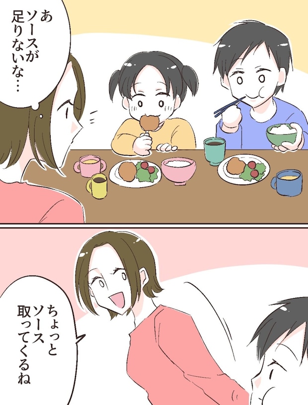 ある日のこと。いつものようにリビングで一人食事をするフトシさんに、おかわりをそっと差し出すヒカリさん。子どもたちと3人での食事にもすっかり慣れ、ソースを取りに行って戻ると、いるはずのないフトシの姿が!ヒカリさんが立ち上がったのを機に、「もういらない」と理解したフトシさんに「私まだ食べてたよ?」と言うと、「だったら席立つなよ!?紛らわしいな~!!」そう言われて、カチンときたヒカリさん、こんなにがめつい夫にうんざりしてしまいますよね。