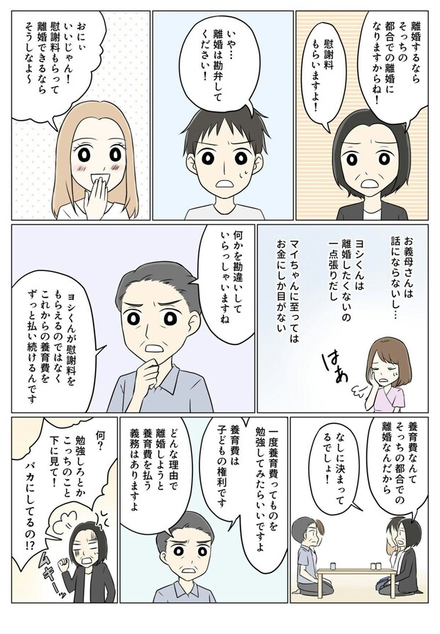 数日後、ヨシ・義母・マイと離婚に向けた話し合いの場が設けられました。義母はお金を取ったことに悪びれる様子もなく、マイに至ってはお金もらえるなら離婚した方がいいと論外の発言…。ヨシは離婚はしたくないと言うものの、義実家と縁でも切らない限りはずっと義母やマイに無心され、利用され続けるのが目に見えていますよね。ヨシの考えを聞き、2人で話そうと別室へ行ったアイコの父は冷静です。