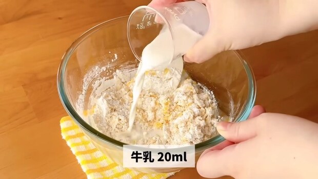 粉っぽさがなくなるまで混ぜ、生地をまとめます。もし、まとまらない場合は、小さじ1ずつ新たに牛乳を加えましょう。