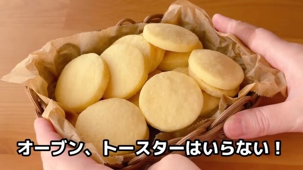 加熱直後はやわらかいですが、網などの上に乗せて完全に冷ますと、サクサクの食感になります。