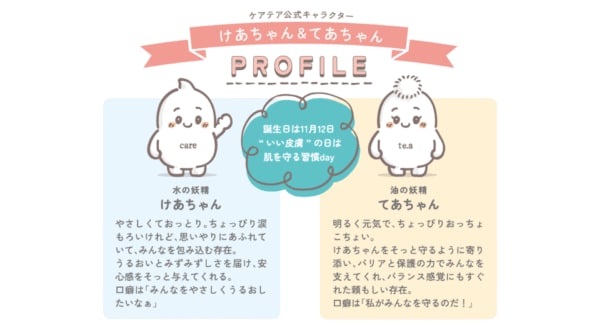 「けあちゃん」は、やさしくておっとりとした性格で、みんなを包み込むような存在。一方、「てあちゃん」は、明るく元気で、少しおっちょこちょいながらも、けあちゃんをそっと支える頼もしい存在だ。性格は真逆のふたりだが、互いに寄り添い、支え合うことで、日々のスキンケアを“癒しの時間”へと導いてくれる。
