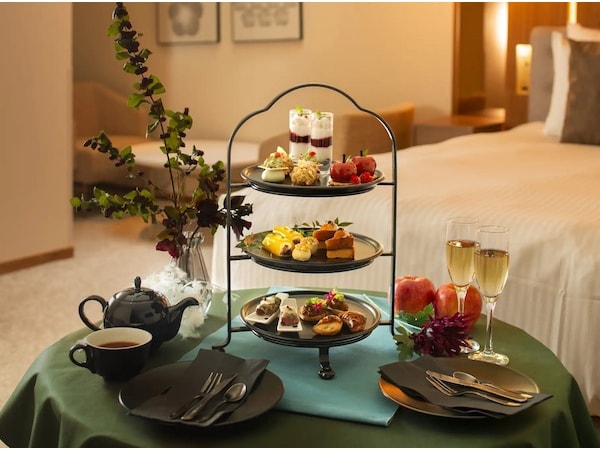 ウェルカムアフタヌーンティーは、宿泊客にルームサービスとして提供する。料金は宿泊料に含まれている。冬メニューとして、鮮やかに彩られた華やかなスイーツとセイボリーが、心躍るひとときを届ける。