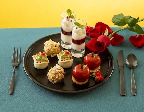 トップティアの「Seasonal Sweets」は、クリスマスの象徴「赤」をテーマに、艶やかなリンゴのムースやベリーのヴェリーヌ、ピスタチオの香るスイーツなどをラインナップ。フルーティーな酸味とやさしい甘みが織りなす、華やかで印象的なひと皿を堪能できる。