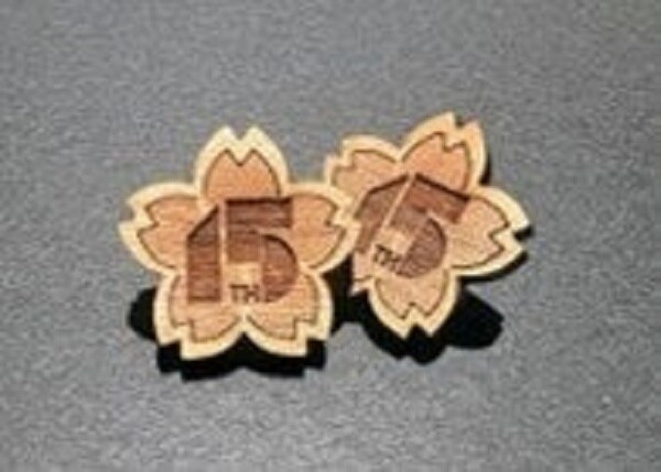 15周年記念の特製木製ピンバッジは、高知県木材協会の協力のもと、高知県産のサクラ材を使用し、職人の手仕事が感じられるあたたかい仕上がりとなっている。品川区と高知県・高知県木材協会は「木材利用促進等に関する協定」を締結しており、このバッジの制作にもその連携が活かされているという。