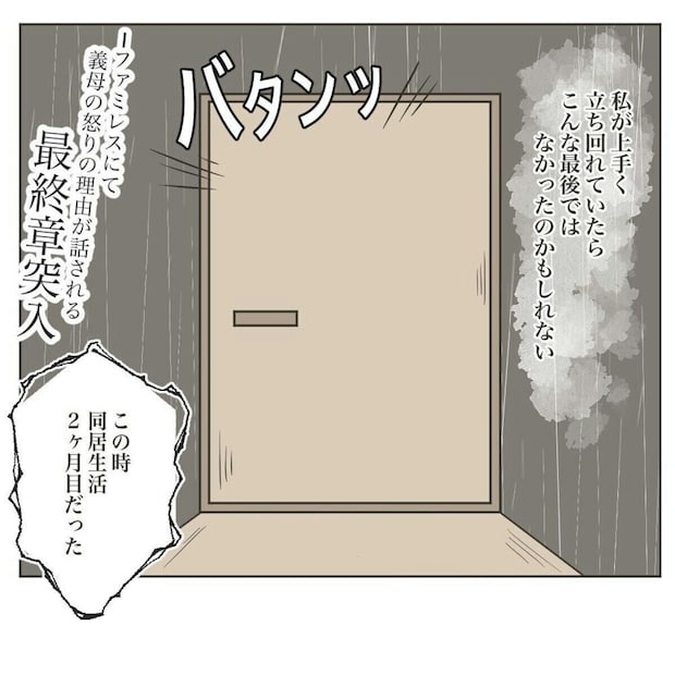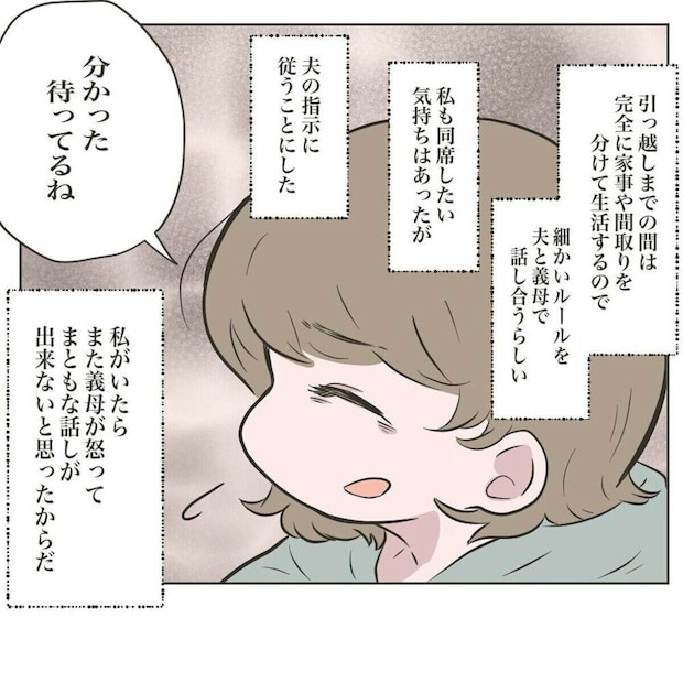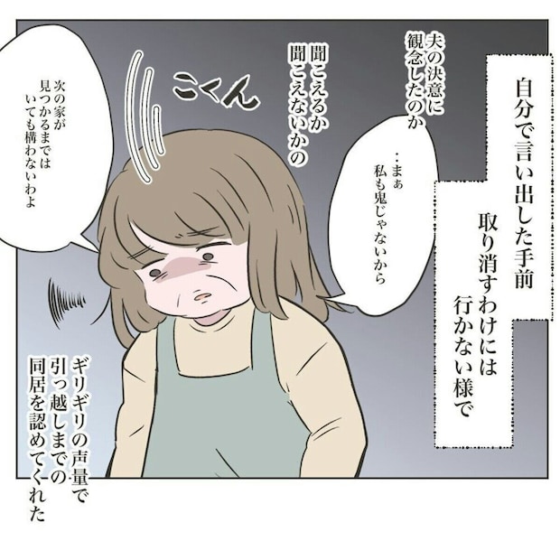 ひとまず同居を続け、引っ越し先が見つかったらすぐに出て行くということで話がまとまりました。義母は最後まで謝ることはなく、出ていけと言った手前、撤回することも難しかったようです。夫と義母は同居を続けるうえでのルールを決めるということで、フォロワーさんは席を外すよう言われます。部屋を出る前に義母へ謝罪をし、話すのはこれが最後かもしれない…と思ったというフォロワーさん。そのくらい関係はこじれてしまったようです。