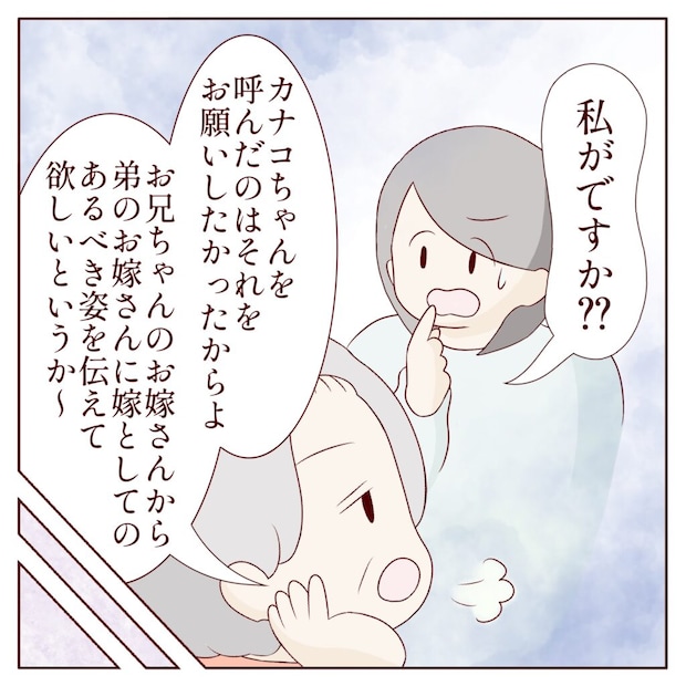 思わず「私がですか??」と驚いて聞いてしまいました。どうやらこの日私が義祖母に呼ばれたのは、ヒナちゃんのことを私に伝えるためだったようです。「お兄ちゃんのお嫁さんから弟のお嫁さんに、嫁としてのあるべき姿を伝えてほしいというか~」と言われてしまいました。えぇ・・・それはリク君とヒナちゃんが話し合うべきことだし、「仕方ないわね」と喜んでお世話してあげる義祖母も考えた方がいいのではと思ってしまいました。