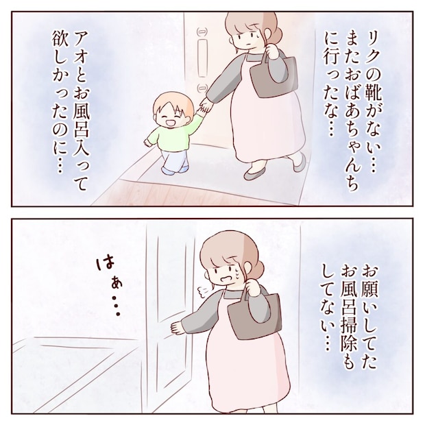 アオ君と一緒に帰ってきたヒナちゃんの姿がありました。玄関にリク君の靴がないことで、またいつものようにリク君が義祖母の家に行っていることが分かったヒナちゃんは、アオ君をお風呂に入れてもらいたかったのにと肩を落とし、お願いしていたお風呂掃除がされていないことにため息をつきました。