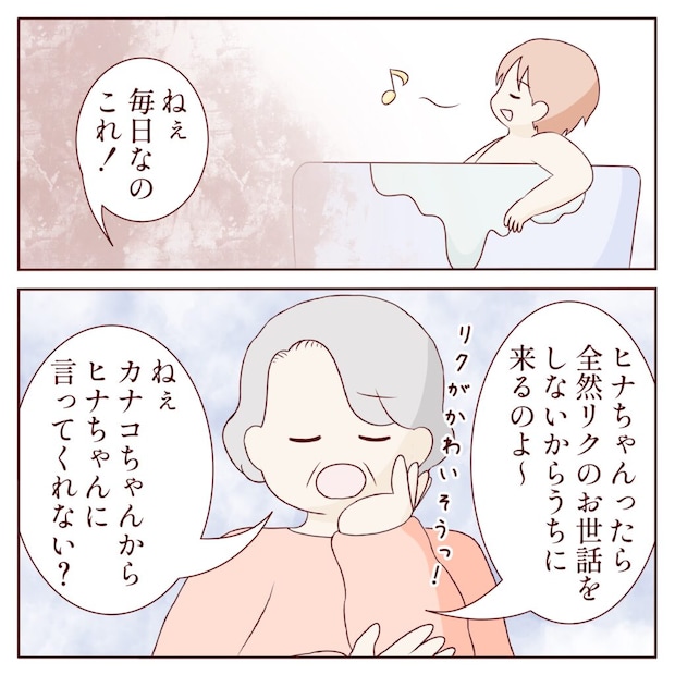リク君がお風呂に入っている間、義祖母は困った顔をして「毎日なのこれ。」と言いました。義祖母の話では、ヒナちゃんがリク君のお世話を全然しないから来るのであり、リク君がかわいそうだというのです。そして、「カナコちゃんからヒナちゃんに言ってくれない?」と言われてしまいました。