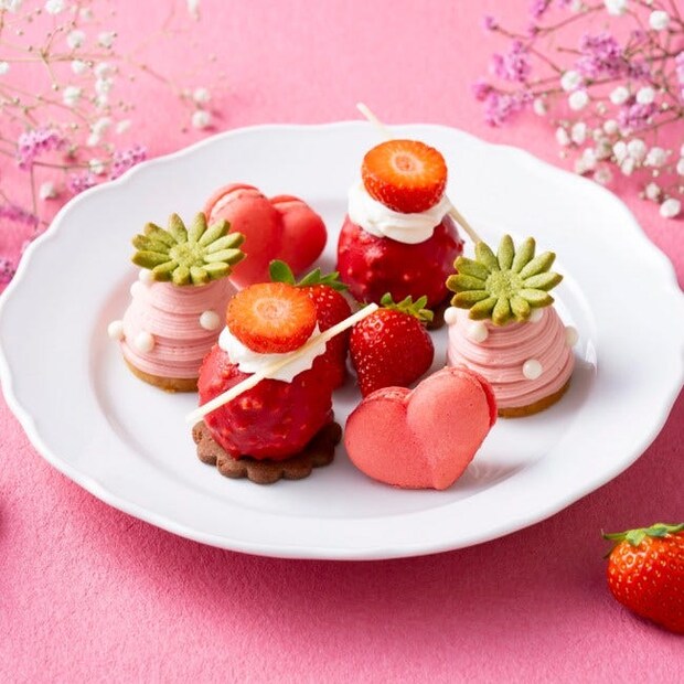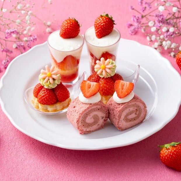 グラススイーツやパイ、ミニロールケーキなど華やかないちごスイーツが勢揃い
