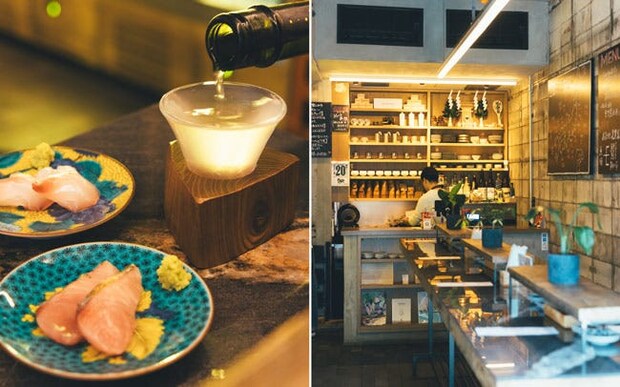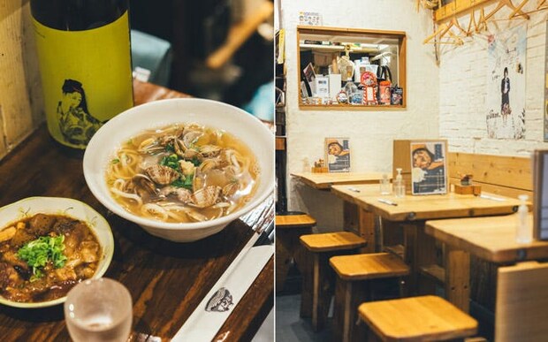 忌野清志郎が使っていたギターやレコードが飾られるうどん屋。夜は出汁を効かせたつまみや、薄衣で揚げる天ぷらなどで日本酒が飲める居酒屋に。