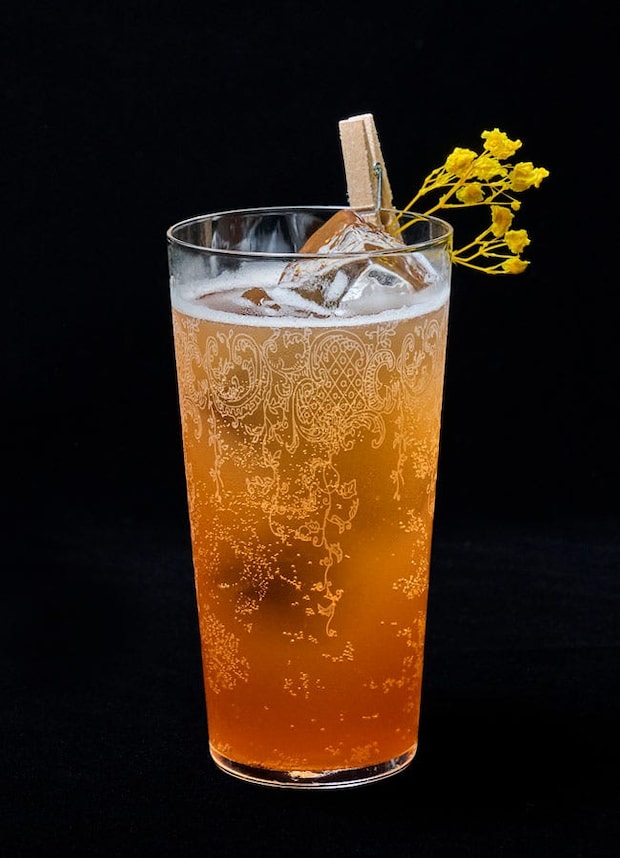 世界5大ウイスキーの原酒を丁寧にブレンドしたウィスキー「碧Ao」がメイン。サントリーリキュール「KANADE〈奏〉桜」などを合わせてシェイクしてグラスに注ぎ、自家製ティーソーダで満たす。仕上げに「KANADE〈奏〉桜」をスプレーしたドライフラワーを。桜の香りと世界中の茶葉の彩りを重ねた1杯