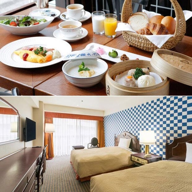 上/和洋中あれこれ食べたい人におすすめの朝食ビュッフェ 下/スタンダードツインのお部屋なら1万円ちょっとで泊まれる日も