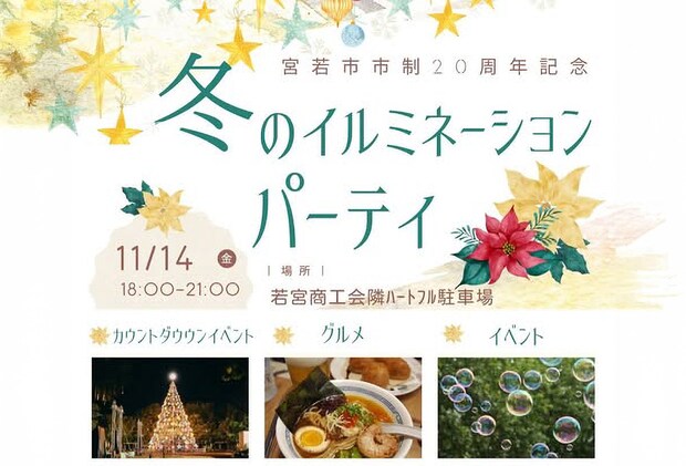 11月14日(金)、若宮コミュニティセンターハートフル駐車場で、宮若市市制20周年を記念して「冬のイルミネーションパーティ」が開...