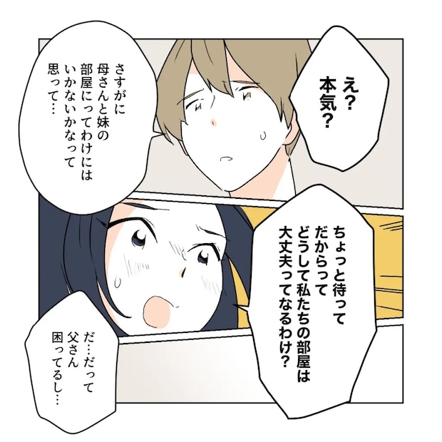 「え?本気?」そう聞き返すと、「さすがに母さんと妹の部屋にってわけにはいかないかなって思って・・」と義母たちを気遣うショウタ。「ちょっと待って。だからってどうして私たちの部屋は大丈夫ってなるわけ?」私への気遣いは一切ないショウタに愕然としながら詰め寄ると、「だ・・だって、父さん困ってるし・・」と義父を心配するショウタ。