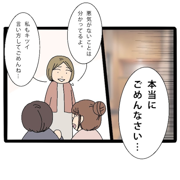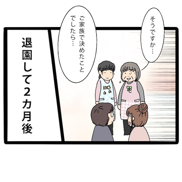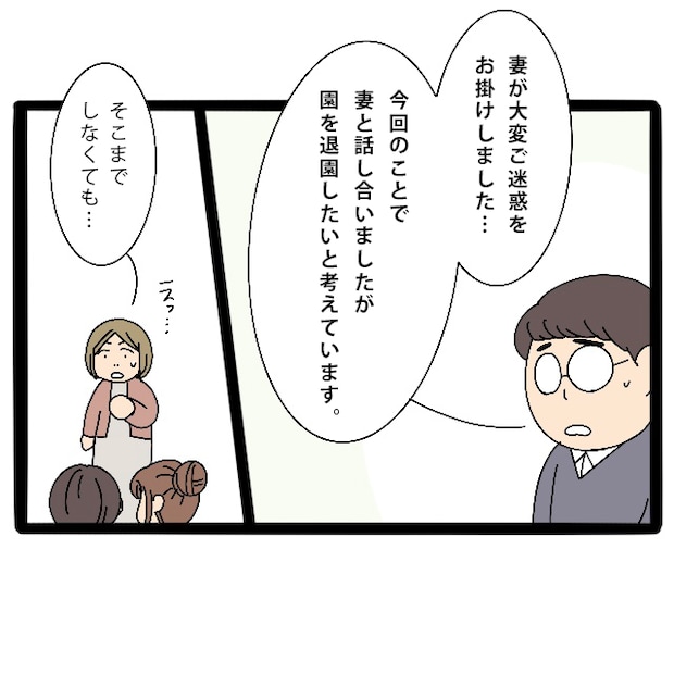 夫は申し訳なさそうに「妻が大変ご迷惑をおかけしました・・・今回のことで妻と話し合いましたが、園を退園したいと考えています」と頭を下げます。その言葉に、さとしくんママは目を丸くして「そこまでしなくても・・・」と言いました。