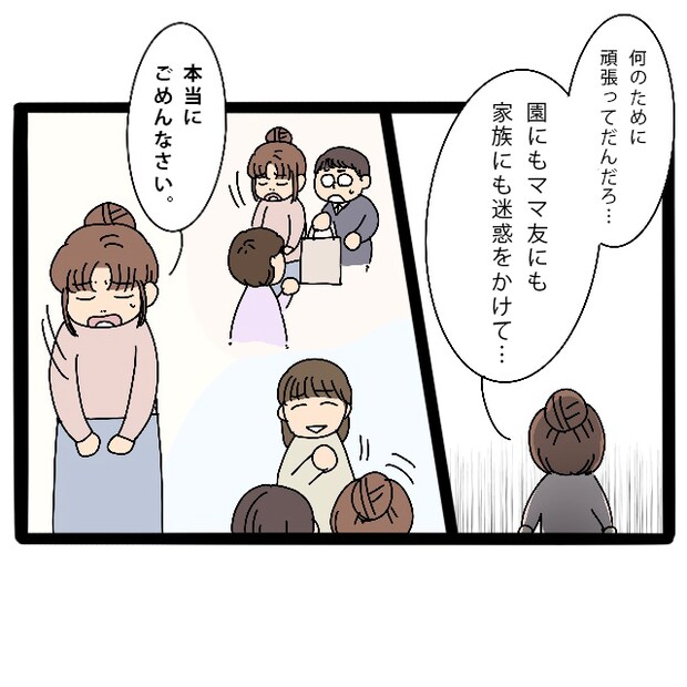 「何のために頑張ってたんだろ・・・園にもママ友にも家族にも迷惑をかけて」自分がしたことの愚かさに気付いた私は、迷惑をかけたすべての人に謝りました。夫も私と一緒に謝ってくれて、本当に頭が上がりません。