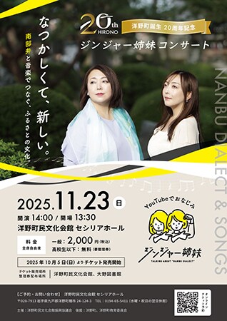 南部地方をテーマに活動する姉妹ユニット「ジンジャー姉妹」は、11月23日(日)、岩手県洋野町民文化会館セシリアホールにて「洋野町誕生20周年記念 ジンジャー姉妹コンサート」を開催する。