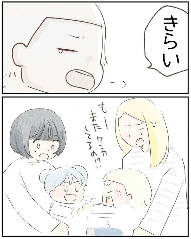 度々ケンカになってしまういちかちゃんとA太君。2歳児はしゃべれるようになっても、まだ言葉を選ぶ技術は難しいお年ごろ。ド直球な言葉にドキリとします。