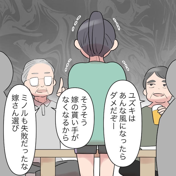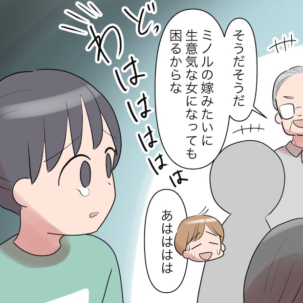 「そうだそうだ。ミノルの嫁みたいに生意気な女に育っても困るからな」と私を全否定する親戚。そう言われているのに「あはははは」と笑っているだけのミノルを見て、ユズキは涙ぐんでいました。