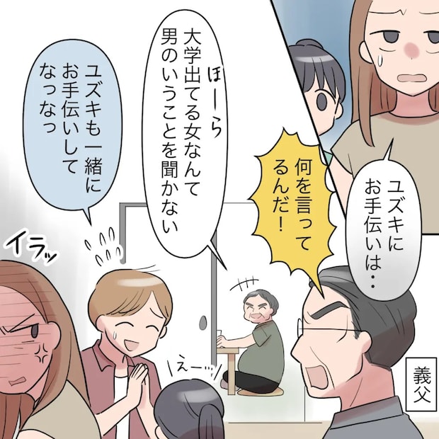 手土産を渡した後、「ユズキにお手伝」いは・・私がそういいかけると、「何を言ってるんだ!」と義父が言い出し、それを聞いていた申請も、「ほーら、大学出てる女なんて、男の言うことを聞かない」と文句を言う親戚にイライラが止まらない私。その頃ミノルは、「ユズキも一緒にお手伝いして。なっなっ」とユズキを説得していました。