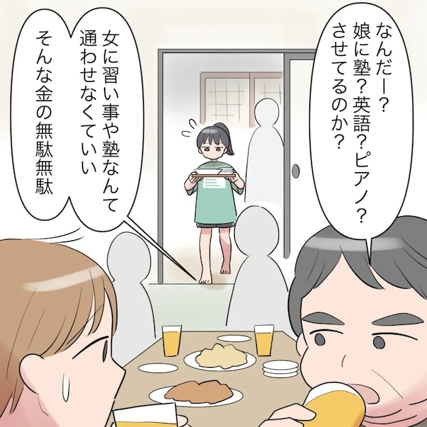 そして席に着いたミノルに、「なんだー!?娘に塾?英語?ピアノ?させてるのか?」そうたずねた後、「女に習い事や塾なんて通わせなくていい。そんなの金の無駄無駄」と一蹴。
