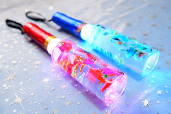 「キラキラペンライトづくり」は、蛍光ビーズやペットボトルのキャップを再利用した材料で作るエコなペンライトのワークショップ。参加材料費は一人500円だ。
