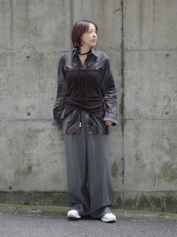 今っぽさをより高めるなら、ニットキャミソールをビスチェ風に着こなすのもテクニック。ブラウンならモードになり過ぎず、スタイリングになじんでくれるところもポイントです!