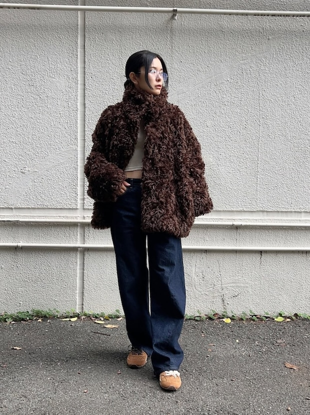 テディベアのようなモコモコとした巻き毛のファーコート。大人らしくシックにまとうなら、落ち着いたチョコレートブラウンを選びたい! ほんのり肌見せでヌケ感も意識して。