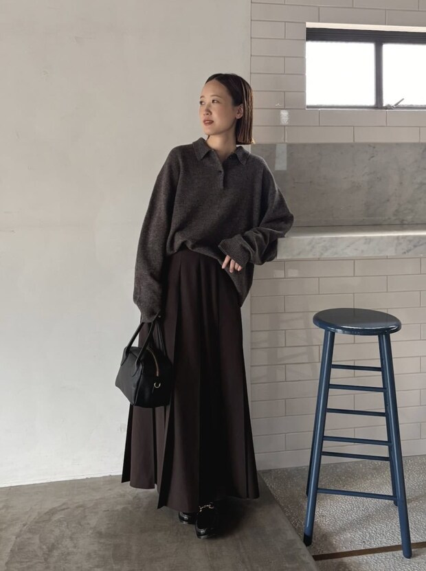 襟つきのポロニットをトラッドに仕上げてくれるプリーツスカート。たっぷりとした生地感のあるスカートですが、チョコレートカラーを選ぶことで軽やかに着こなせます。