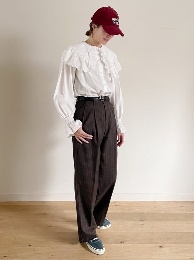 大きな襟やカフスのレースが印象的なブラウスの甘さを、スーツライクなストライプパンツがしっかり中和。ブラウンを選ぶことであえて「おじさんぽさ」を出し、渋みをプラスするのがポイントです!
