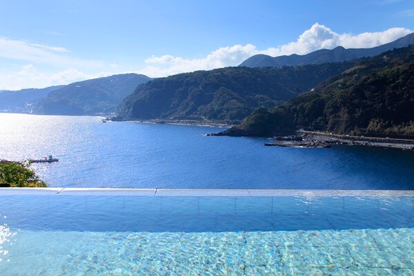 空と海と湯舟が一体に見える大露天風呂では、開放感あふれる眺望を楽しみながら、日常を忘れて心身をゆるめる時間を過ごせる。