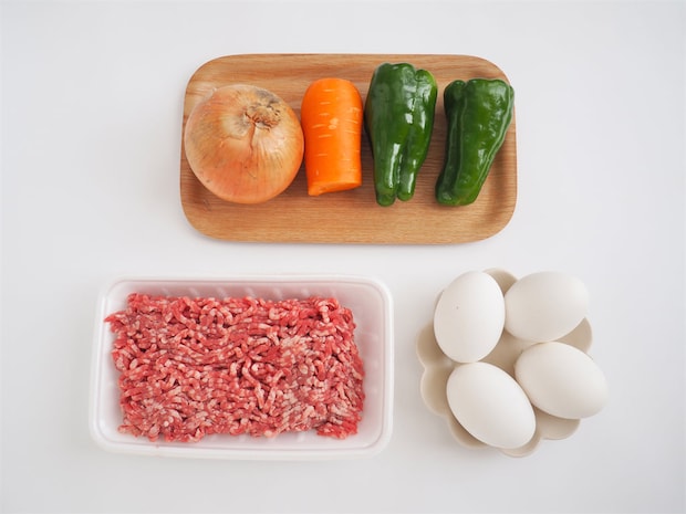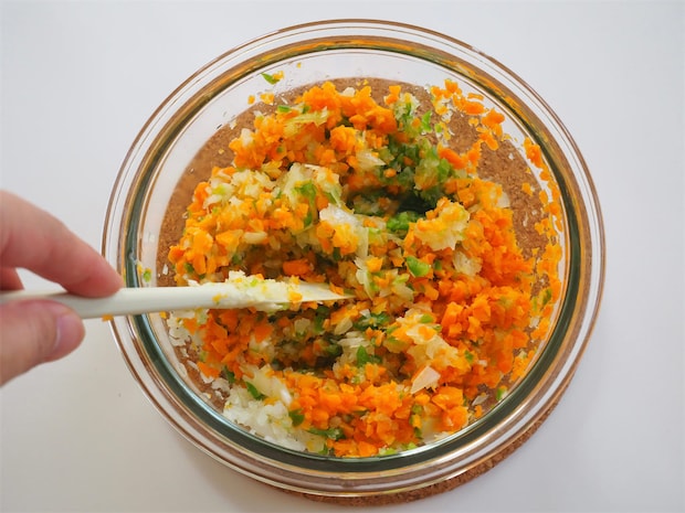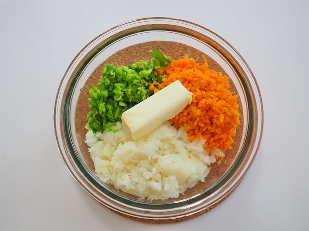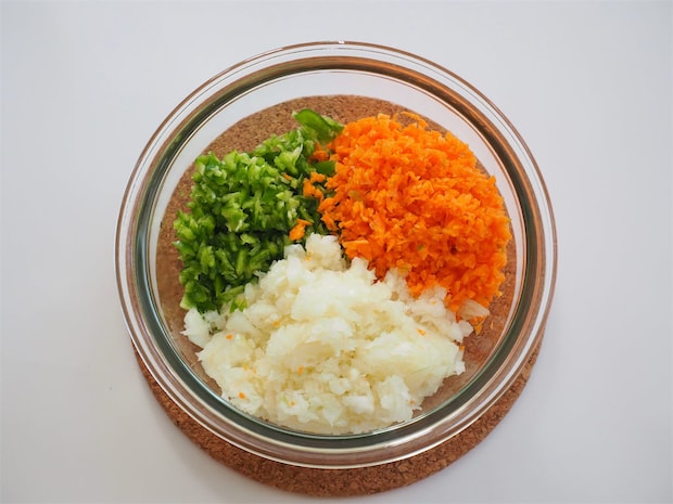1. 玉ねぎ、にんじん、ピーマンをみじん切りにして、600wの電子レンジで3分加熱する。熱いうちにバターを入れて、全体に馴染ませて冷ましておく。