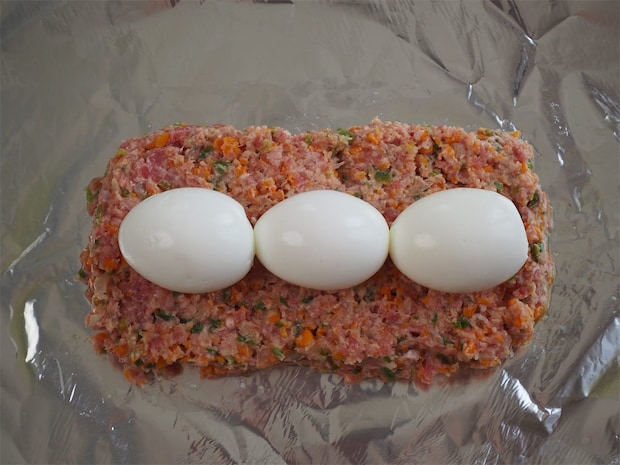 4. アルミホイルの内側に油(分量外)を塗り、肉だねの半量をのせて茹で卵を並べる。