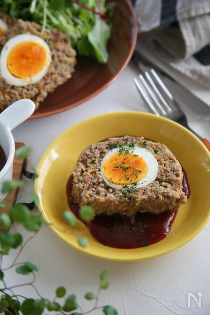 4. アルミホイルの内側に油(分量外)を塗り、肉だねの半量をのせて茹で卵を並べる。