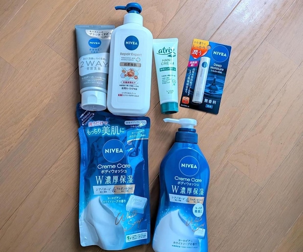 内容:「ボディウォッシュW濃厚保湿」、「ボディウォッシュW濃厚保湿 詰め替え用」、「2WAY美容洗顔」、「薬用エクストラボディミルク」、「薬用ハンドクリーム」、「ディープモイスチャーリップ」