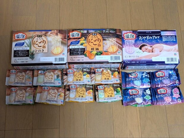 内容量:「おやすみアロマ」「とろりにごり浴ひのき」「とろりにごり浴柑橘」(各12袋入)