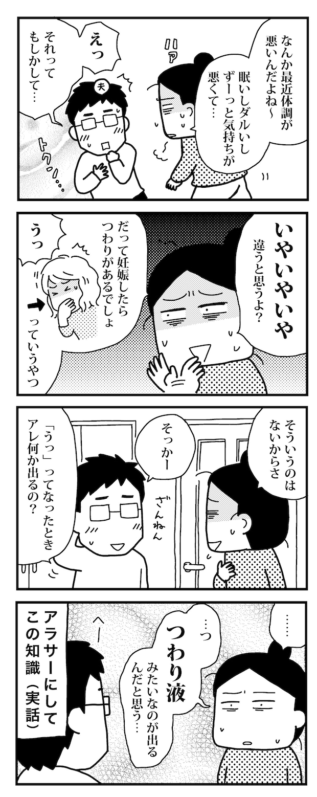 最近、体調が悪いと夫に話をする和田さん。和田さんの言葉を聞いた夫は、妊娠しているのでは?と期待をしますが、つわりなはずがないと否定をします。和田さん自身も初めての妊娠ということで、妊娠超初期に出る症状についてわからない部分もありました。