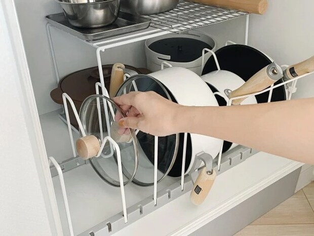 かさばるので重ねて収納してしまいがちなフライパンやお鍋を片手ですっと取り出せる収納スタンド。仕切りパーツの位置は3cmごとに調整できる優れもの!