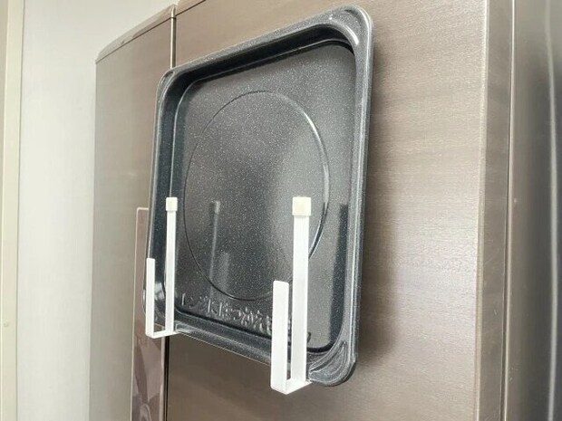 2個組のトレーホルダーは、収納したいトレーの大きさに合わせて幅を調整できるから、トレーの大きさや形を選びません。フックとしても使えて便利!