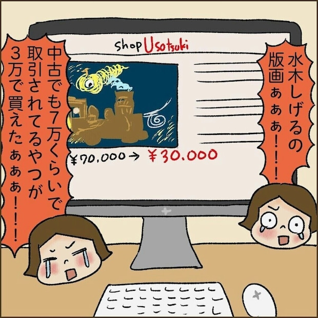忍者ママさんは。ずっとほしかった作者のお憧れの版画を見つけます。定価よりもずっと安く。ラッキー!とばかりにすぐに購入を決意します。