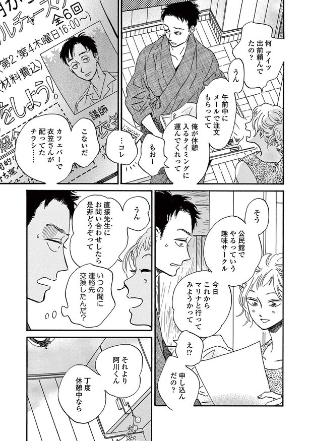 前回、10代の頃の片想い相手・文太と2人きりになった毬奈。しかし、文太は元カノに呼び出されて急に出かけてしまった。そんな中、龍平が環達の元へ蕎麦の出前をする。そこで環が公民館で開かれる衣笠の講座に参加すると知って…!?