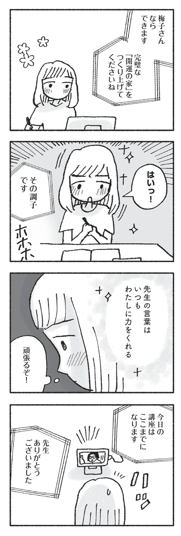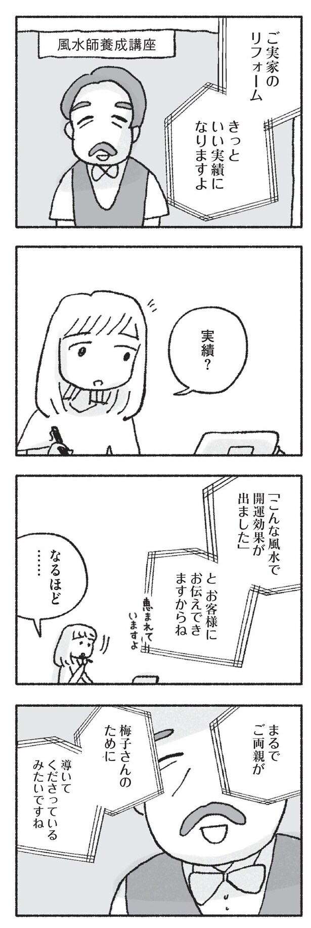 2人の子供と優しい夫に囲まれて幸せに暮らしている専業主婦・梅子。その一方で自分に自信が持てない梅子は、大人になってから「ツイてない」と思うことが増えていた。そんな中、亡き両親が遺した実家のリフォームを計画するが、実家で娘が怪我をするなど不運な出来事が続いたことに不安を覚えた梅子は、親友からの勧めで半信半疑ながらも風水師を頼ることに。風水を意識し始めてから小さな幸運が続き、効果を実感した梅子はどんどん風水に執心していくようになり――?
