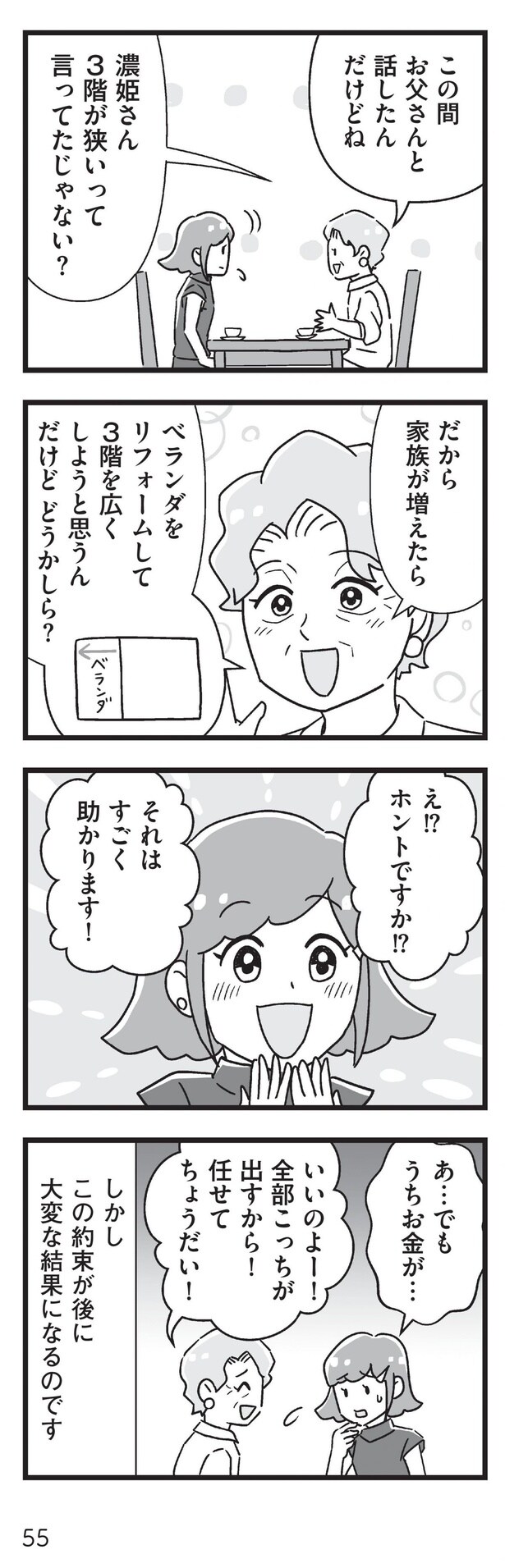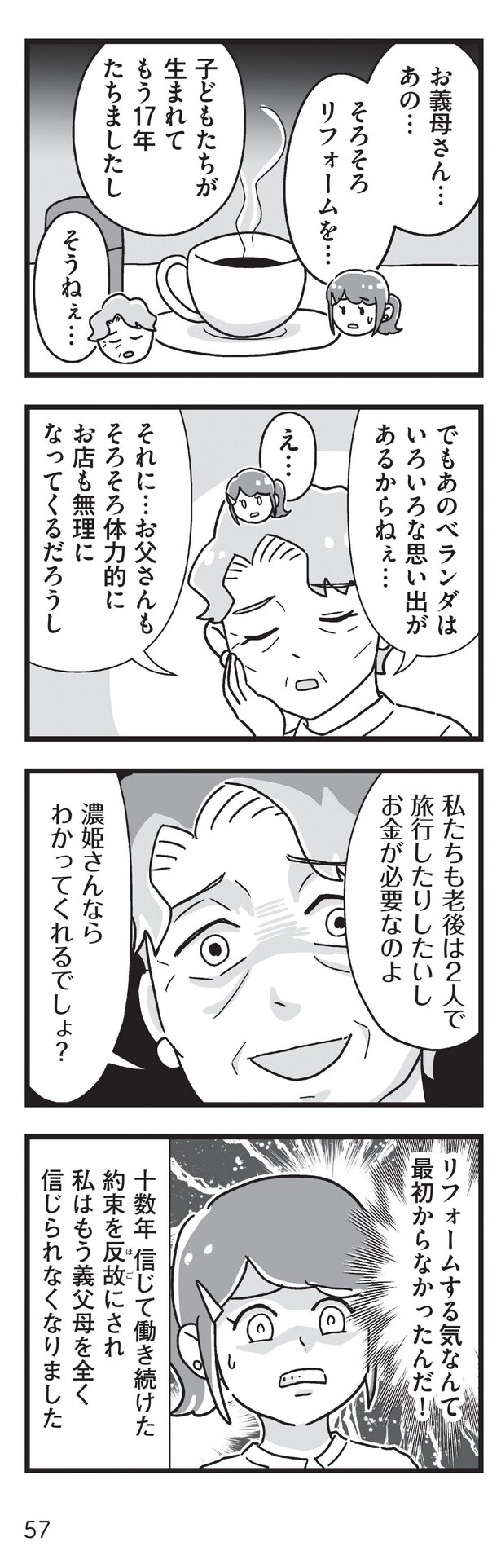 前回、濃姫の元に不倫相手へ送るメッセージを誤送信した夫。クレカで落とされた5万円についても追及すると、夫は苦しい言い訳をし、濃姫は呆れてしまった。そして振り返るのは結婚当初のこと。義母は同居する家のリフォーム代を出してくれると言っていたが、17年経ってもその約束が果たされることはなく…!?