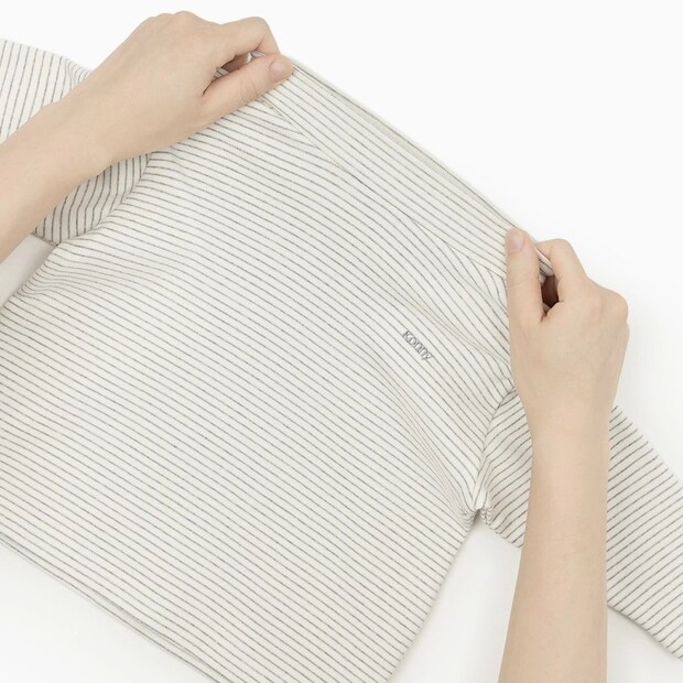 首からの寒さを防いでくれるモックネックタイプで、伸縮性があるので、すぽっと着せやすいのも特徴。滑らかでちょうどいい厚みの素材感です。
