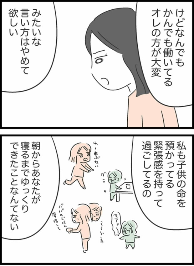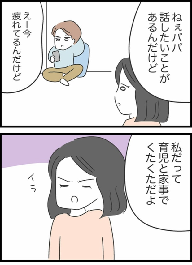 友人の話を聞いて、「うちも変われるかもしれない!」と希望を持ったようこ。帰宅後すぐに、夫・しょうたに「話したいことがある」と伝えました。しかし、しょうたは「疲れてるのに…」と乗り気ではなく専業主婦で家にいるようこと、外で働く自分を比較して、「会社で働く方が大変だ」とマウントを取ってきたのです。
