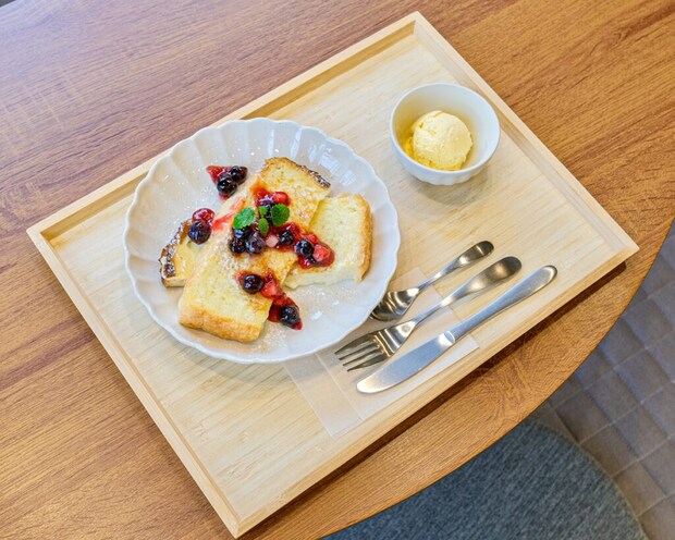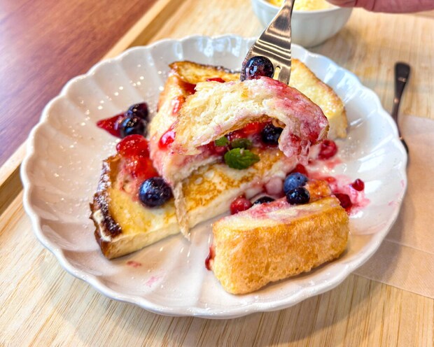 ふわふわのトーストに、とろりと流れる果肉たっぷりのベリーソース。