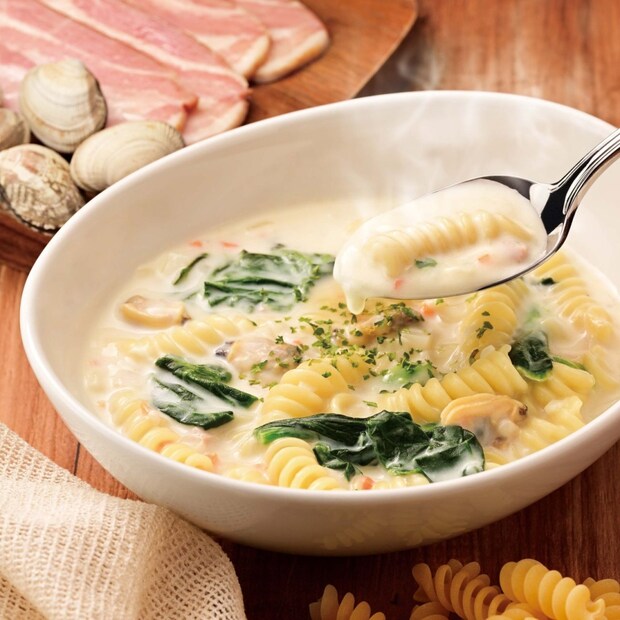 じっくり煮込んだアサリの旨味が広がるクリーミーなスープに、玉ねぎやほうれん草など4種類の野菜を加えた具だくさんなスープパスタ。パスタには、らせん状の形状でモチモチ食感が特徴のショートパスタ「フジッリ」を使用。スープには生クリームを贅沢に使い、麺にも絡むとろみを持たせつつ酸味を加え、最後まで軽やかに飲み切れる味わいに仕上げたとしている。
