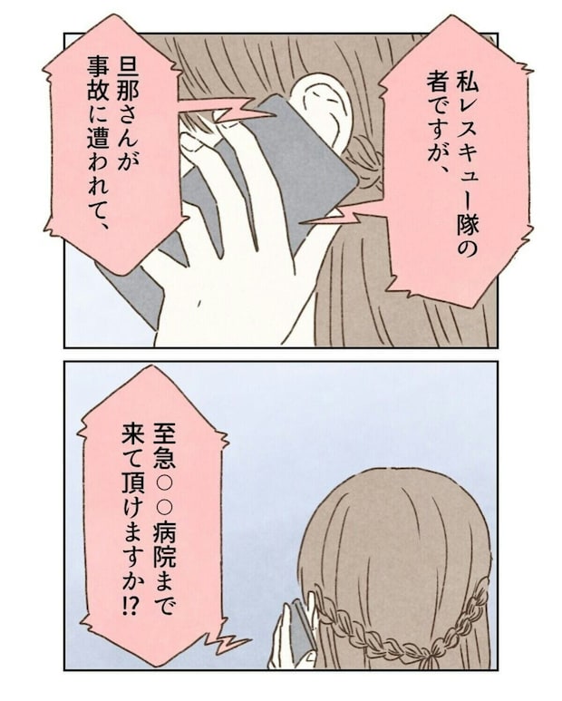 第2子の妊娠中、自宅で娘と過ごしていたところに、知らない番号から電話がかかってきます。レスキュー隊からの電話で、夫が事故にあい、病院へ搬送されたことを知らされます。