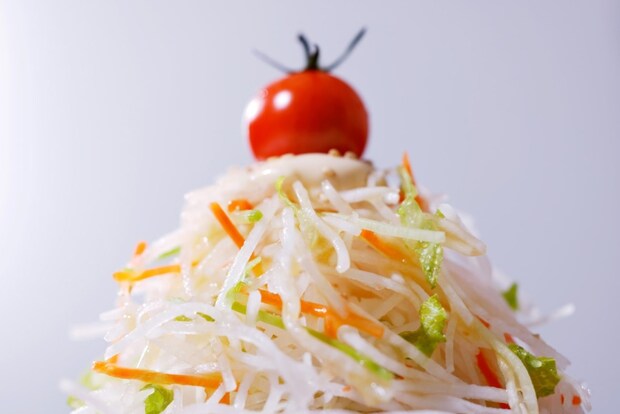 シャキシャキでみずみずしい大根がメインのサラダ。専用スライサーを使い、冷却しながらカットをすることで、水分を保ちシャキシャキ食感を実現している。